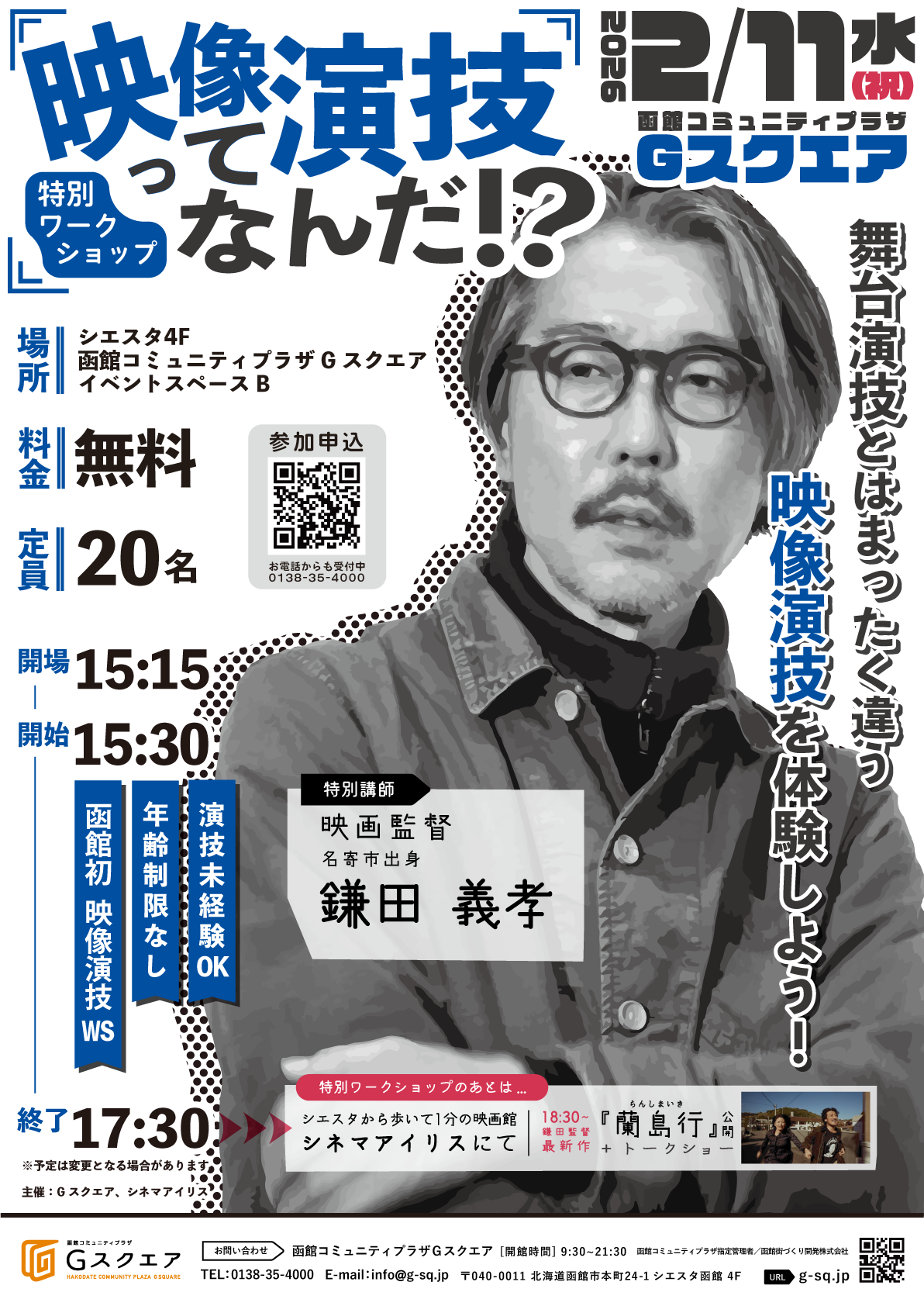 《映像演技ってなんだ⁉》北海道名寄市出身の現役映画監督鎌田義孝氏による、映像演技ワークショップを開催!舞台演技とはまったく違う映像演技をGスクエアで体験しよう!演技未経験の方、年齢不問、どなたでも参加OK!参加無料です!