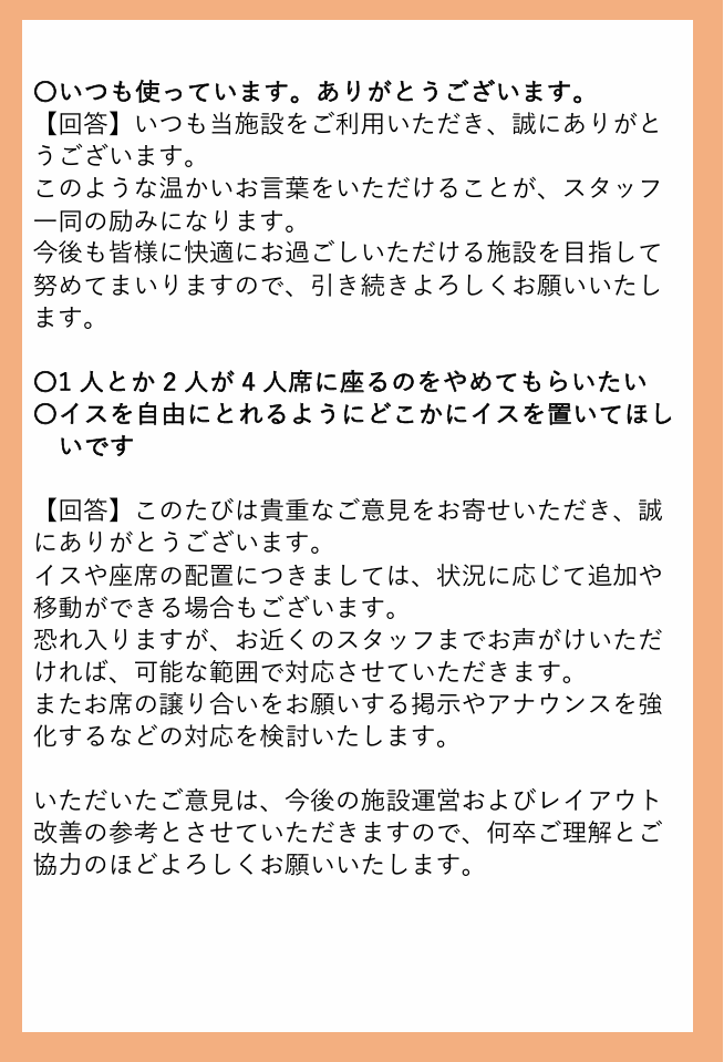 皆さまからいただいたご意見への回答をご紹介いたします。